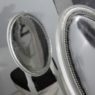 Sedia Eva scorniciata a sciabola, laccata bianca ed argento e tappezzata in tessuto.
