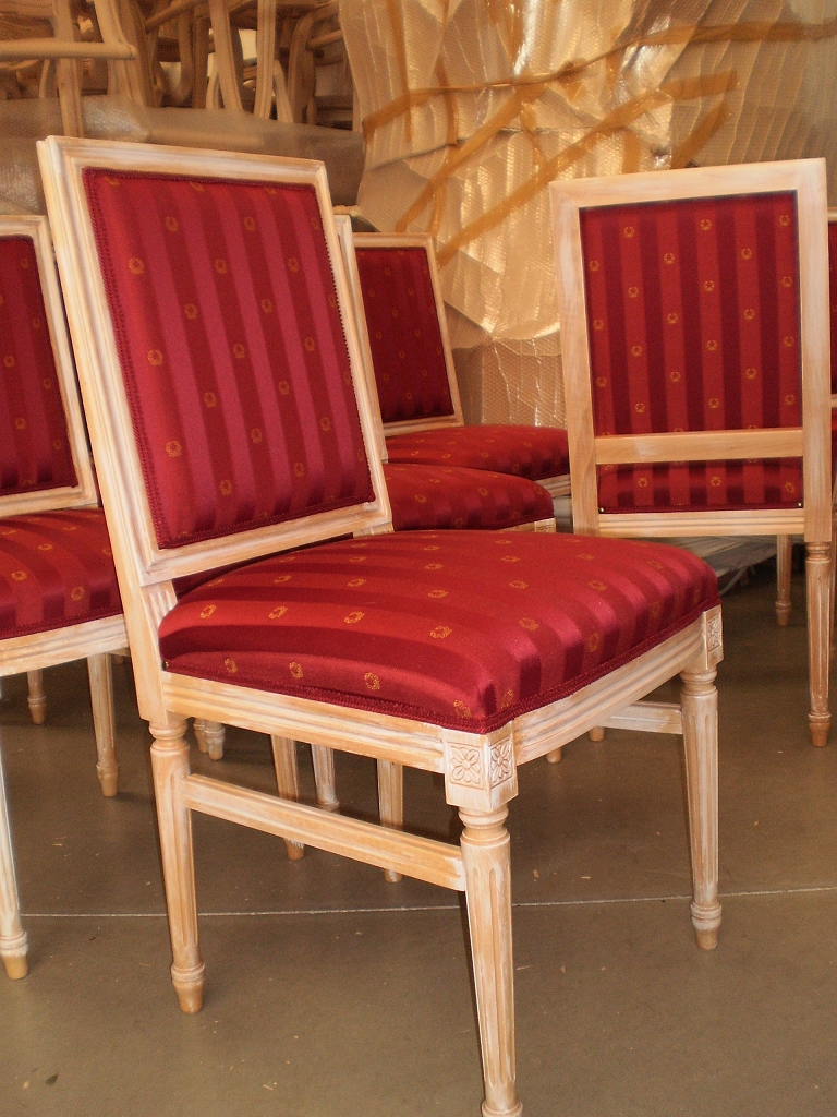 Sedia Luigi XVI Quadra, lucidata noce con tappezzeria in tessuto.