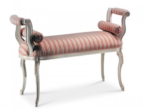 Panca Versailles, laccata bianca con finiture rosa, tappezzeria in tessuto.